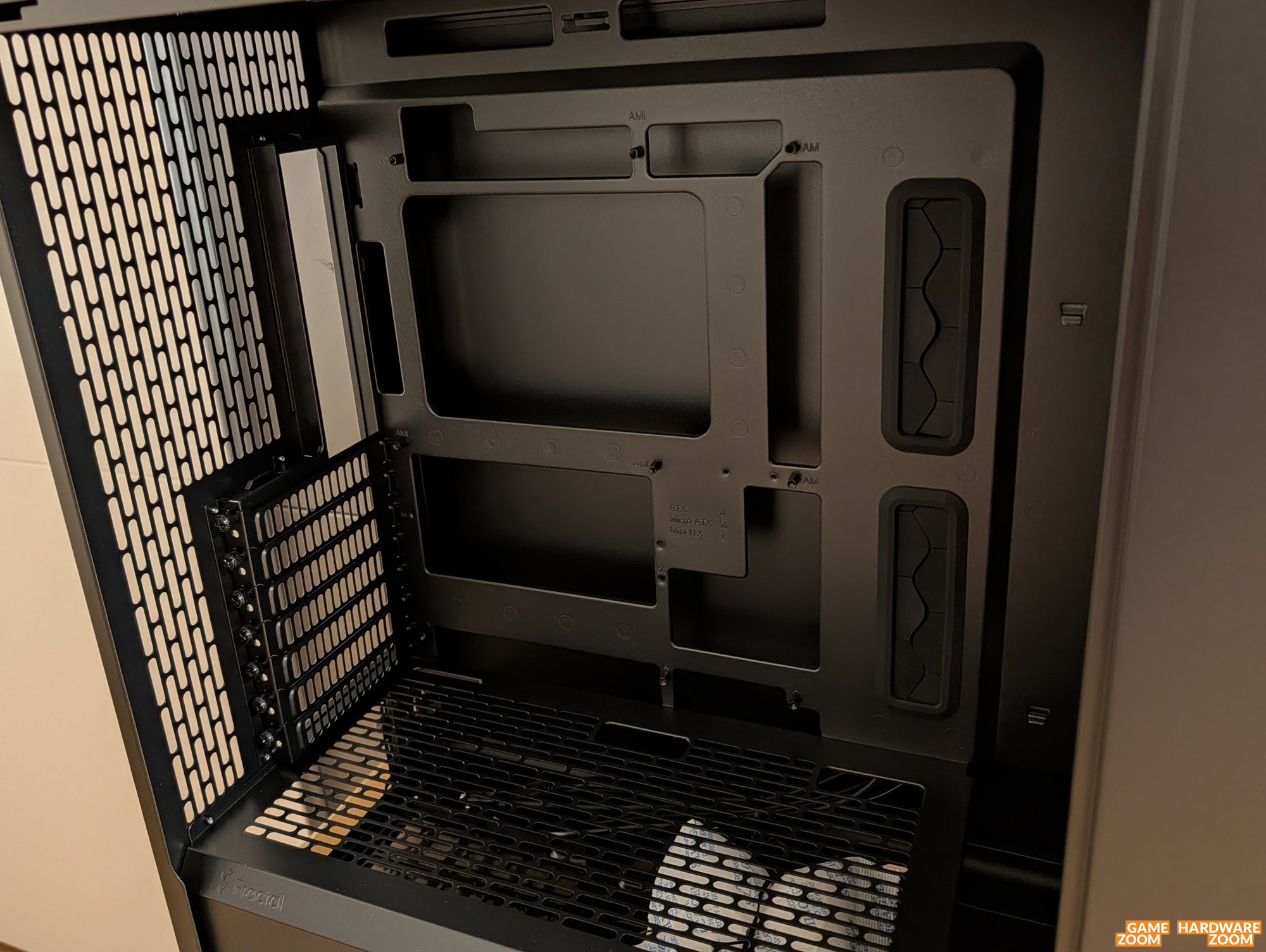 Das Gehäuse bietet ausreichend Platz im Innenraum für bis zu 17.6 Zentimeter hohe CPU-Kühler und Mainboards bis zum E-ATX-Format. Die maximale Grafikkartenlänge beträgt 41.3 Zentimeter (mit Frontlüfter ohne Radiator; 38 Zentimeter mit Radiator). Die Montage der Erweiterungskarten erfolgt mit den bewährten Rändelschrauben, die einen Schraubenzieher meist überflüssig machen. Der Mainboardtray besitzt eine große Aussparung auf Höhe der CPU, so dass eine Kühlerinstallation mit Backplate auch im eingebauten Zustand möglich wird. Darüber hinaus gibt es zahlreiche Kabeldurchführungen zum rückwärtigen Verstauen der Verbindungskabel.