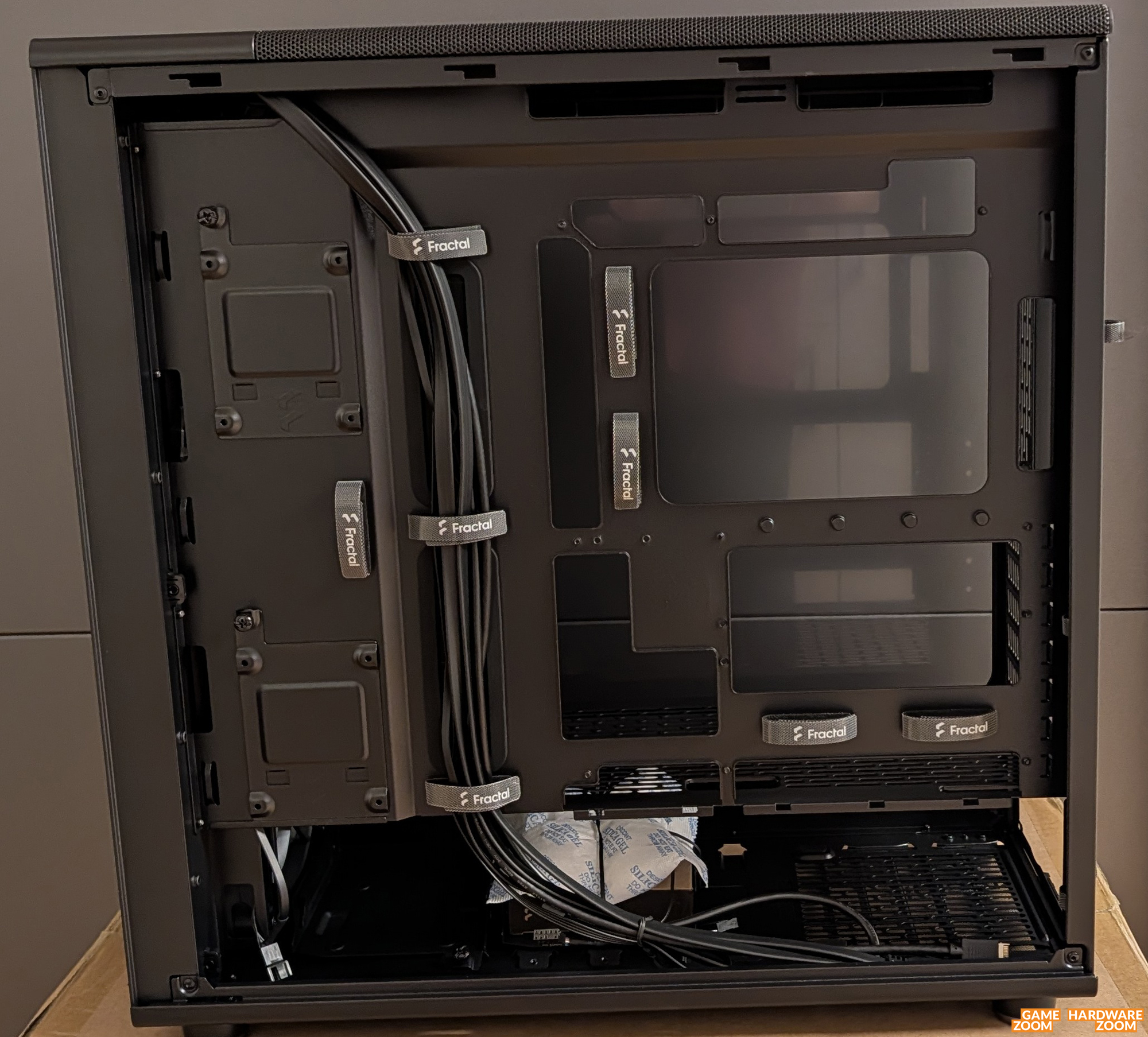 Hinter dem Mainboadträger sorgen einige Klettverschlüsse für ein sauberes Kabelmanagement. Der verlängerte Bereich des Mainboardschlittens wurde direkt hinter der Gehäusefront neben einer Kabelführung auch mit zwei modularen Rahmen zur Montage von 2.5“-Laufwerken ausgestattet. In der Netzteilkammer findet man zwei modulare Festplattenrahmen, in welchem man je eine 2.5“- oder 3.5“-Festplatte montieren kann.