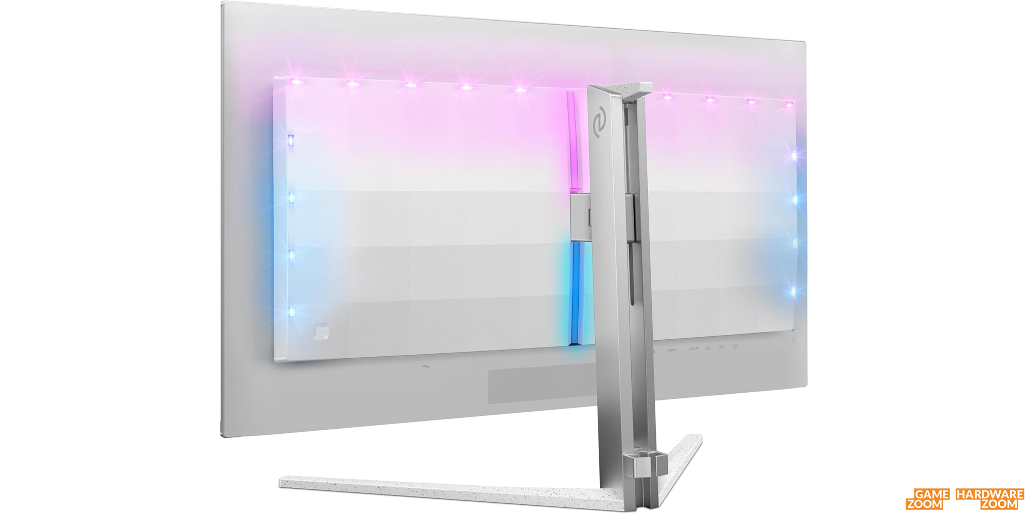 Unser Testmuster kommt in einem stabilen und farblich bedruckten Karton daher. Der 32-Zoll-Monitor misst mit komprimierten Standfuß 717x442x200 mm (BxHxT) und bringt 9.65 Kilogramm (inklusive Standfuß) auf die Waage. Im Lieferumfang enthalten sind: HDMI-Kabel, DisplayPort-Kabel, USB-Upstream-Kabel, Netzkabel und VESA-Halterung. Das interne Netzteil wird mit einem handelsüblichen Kaltgerätestecker mit Strom versorgt. Der hellgrau beschichtete 32M2N8900 wurde sehr wertig gefertigt und hinterlässt optisch gesehen einen guten Eindruck. Das recht dünne OLED-Display des Monitors bietet an der Oberkante und den Außenkanten ein fast rahmenloses Design. Positiver Nebeneffekt der Beschichtung: Der Monitor ist wenig bis gar nicht anfällig für feine Kratzer und Fingertapser. Der Standfuß aus Metall mit Kabelhalterung an der Rückseite ist zwar sehr elegant aber könnte eine Spur stabiler sein. Die Rückseite beherbergt nicht nur die Philips Ambiglow Beleuchtung, sondern auch Lüftungsschlitze für das passive Kühlsystem. Unser Testmuster bietet diverse Ergonomie-Funktionen: Höhe (130 mm), Neigen (+20/-5 Grad) und Drehen (±30 Grad). Verarbeitungsmängel konnten wir an unserem Gerät nicht feststellen.