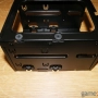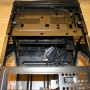 Das Case wirkt rundum ausgesprochen sauber verarbeitet. Sämtliche Anbauteile lassen sich einfach demontieren und wieder zusammensetzen. Fixiert werden die Gehäuseteile mit Großkopfschrauben, die den Einsatz von Werkzeug überflüssig machen. Das Chassis wurde aus Stahlblech gefertigt und Außen sowie Innen zur Gänze schwarz lackiert. Das Mainboard wird auf einem herausziehbaren Schlitten montiert, der mit mehreren Schrauben an der Rückseite gelöst werden kann. Die Seitenwände lassen sich nicht demontieren. Zum Laufwerkseinbau gelangt man von oben über den Deckel, der sich bequem abheben lässt und einen vollen Zugang zum Innenbereich ermöglicht. Sämtliche Schächte lassen sich mit wenigen Handgriffen herausnehmen, bestücken und wieder einsetzen.