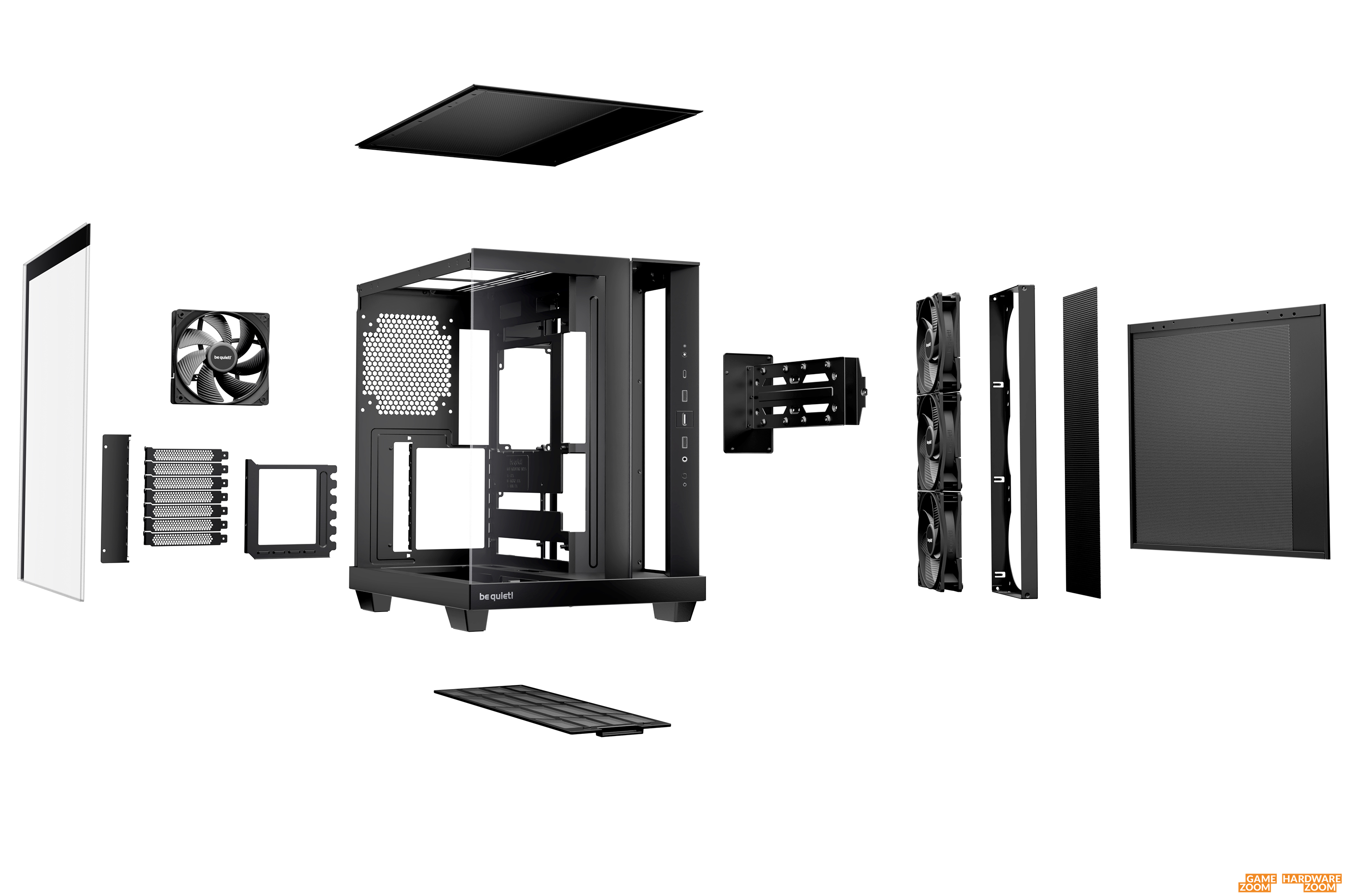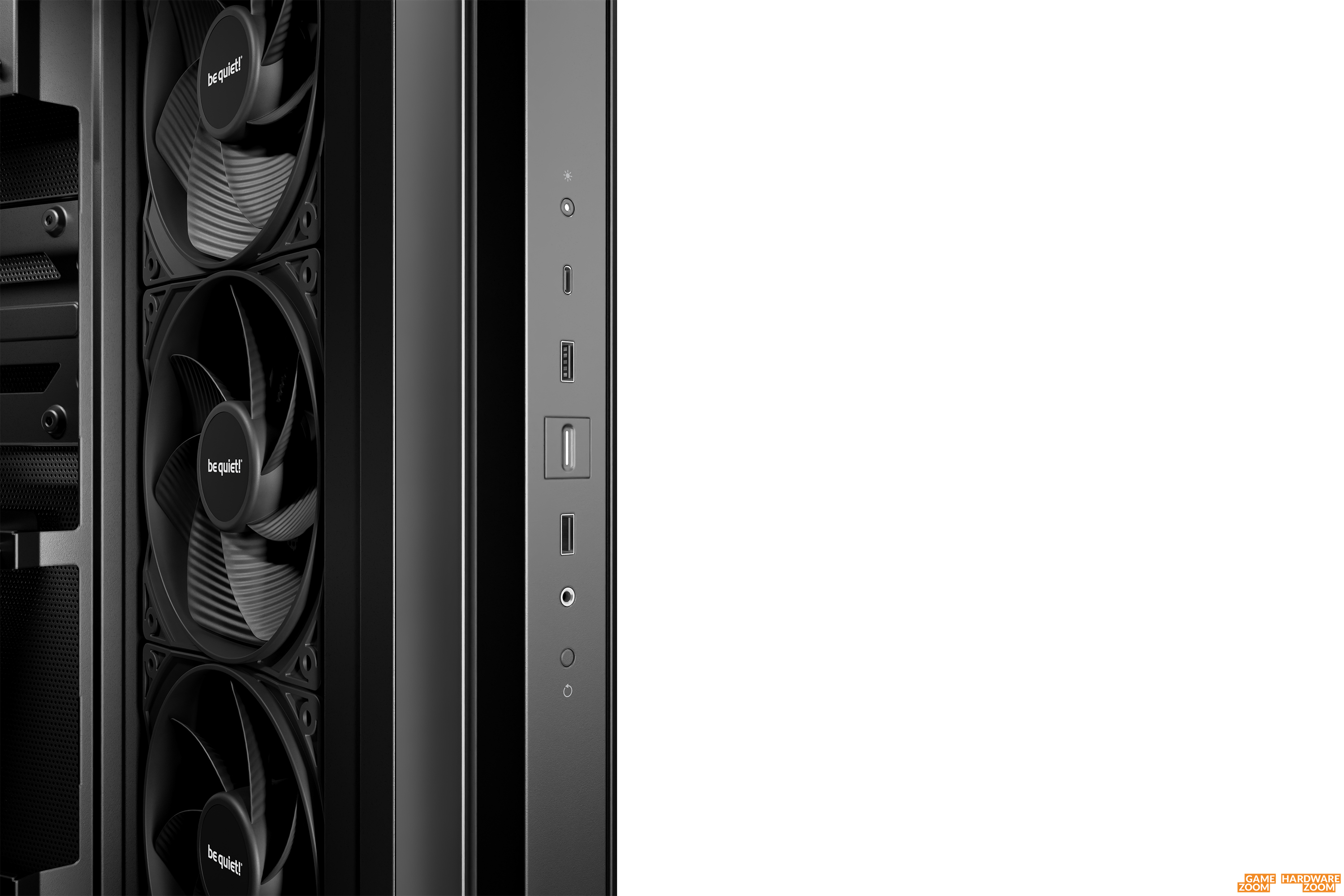 Da die Front und das linke Seitenteil aus Glas sind, hat unser Sample einen gewissen „Showfaktor“. Die vordere Glasscheibe deckt nicht die gesamte Front ab. Es bleibt ein Bereich übrig, den be quiet! zum einen für den Frontlufteinlass, zum anderen aber auch für das I/O-Panel nutzt. Dieses umfasst zweimal USB 3.0, einmal USB-C und eine kombinierte Audiobuchse. Ebenfalls vorhanden sind eine Power- und Resettaste. Die schräg orientierten Frontlüfter können sowohl von vorn als auch durch das perforierte Stahlseitenteil Frischluft ansaugen. Die Luftlöcher ziehen sich auch über den Bereich, hinter dem die beiden Netzteilplätze liegen. Leider gibt es für das Stahlseitenteil und dem Deckel keinen Staubfilter. An der Schräge vor den Frontlüftern sitzt aber ein magnetisches Staubgitter, das zur Reinigung leicht herausgezogen werden kann. Für Frischluft sorgen die drei vormontierten Pure Wings Reverse 120mm PWM Black Lüfter (1600rpm, 1.34mmH₂O, 87.51m³/h, 25.5dB(A)). Am Gehäuseboden können maximal drei 120-mm-Lüfter nachgerüstet werden. Die sitzen vertieft, so dass sie bei Standarddicke elegant integriert werden.