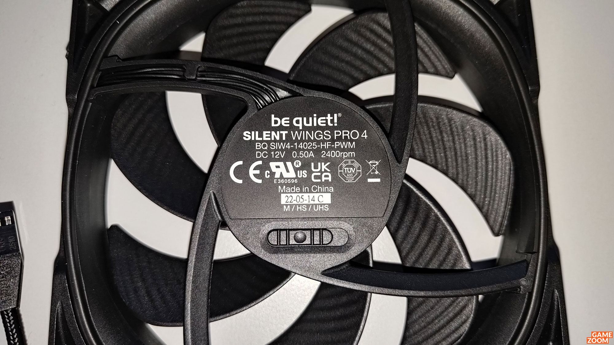 Neu ist bei den Pro-Modellen der Schiebeschalter an der Rückseite. Dieser limitiert die maximale Drehzahl in drei Stufen. Beim Silent Wings Pro 4 120mm PWM kann die Maximaldrehzahl so von 3.000 U/min auf 2.500 oder 1.600 U/min und beim Silent Wings Pro 4 140mm PWM von 2.400 U/min auf 1.900 und 1.100 U/min abgesenkt werden. Diese Änderungen können sogar im laufenden Betrieb vorgenommen werden.